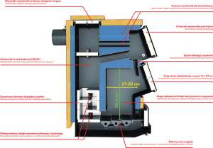- Kocioł dolnego spalania – umożliwia komfortowe dokładanie opału oraz brak efektu kopcenia – opał pali się od dołu do góry dzięki odwróconego kierunkowi procesu spalania względem kotłów typu „górnego spalania”.